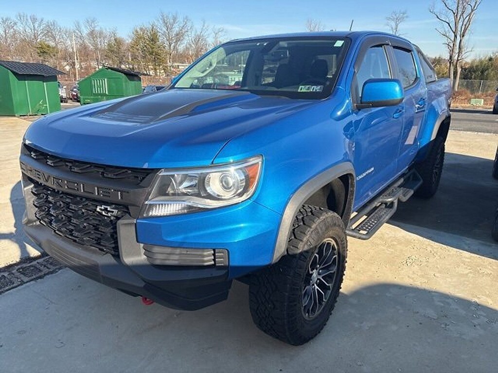 2022 Chevrolet Colorado ZR2 Bright Blue Metallic Chevrolet Certified Pre-Owned Certified, 4WD, 3.42 Rear Axle Ratio, 4-Way Power Front Passenger Seat Adjuster, 4-Wheel Disc Brakes, 6 Speakers, 6-Speaker Audio System Feature, ABS brakes, Air Conditioning, Alloy wheels, AM/FM radio: SiriusXM, Apple CarPlay/Android Auto, Auto-dimming Rear-View mirror, Automatic temperature control, Black Rear Bumpers, Black Spray-On Bedliner w/Chevrolet Logo, Compass, Delay-off headlights, Driver 6-Way Power Seat Adjuster, Driver door bin, Driver vanity mirror, Driver-Selectable Full-Locking Front Differential, Driver-Selectable Full-Locking Rear Differential, Dual front impact airbags, Dual front side impact airbags, Electronic Stability Control, Exterior Parking Camera Rear, Front anti-roll bar, Front Bucket Seats, Front Center Armrest, Front reading lights, Front wheel independent suspension, Fully automatic headlights, HD Radio, Heated door mirrors, Heated steering wheel, Heavy-Duty Trailering Package, Hitch Guidance, Illuminated entry, Integrated Trailer Brake Controller, Leather-Appointed Seat Trim, Low tire pressure warning, Occupant sensing airbag, Outside temperature display, Overhead airbag, Overhead console, Panic alarm, Passenger door bin, Passenger vanity mirror, Power door mirrors, Power Driver Lumbar Control Seat Adjuster, Power driver seat, Power Passenger Lumbar Control Seat Adjuster, Power passenger seat, Power steering, Power windows, Preferred Equipment Group 4ZR, Premium audio system: Chevrolet Infotainment 3 Plus, Radio data system, Radio: Chevrolet Infotainment 3 Plus System, Rear reading lights, Rear seat center armrest, Rear step bumper, Rear window defroster, Remote keyless entry, Security system, SiriusXM Radio, Speed control, Speed-sensing steering, Steering wheel mounted audio controls, Tachometer, Telescoping steering wheel, Tilt steering wheel, Tow/Haul Mode, Traction control, Trip computer, Variably intermittent wipers, Wheels: 17 x 8 Graphite & Oxide Gold Aluminum, Wireless Charging for Compatible Cell Phones, ZR2 Off-Road Package, 4WD.