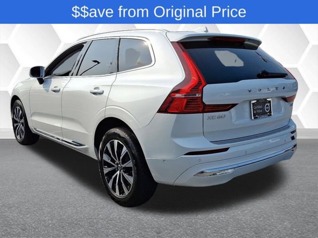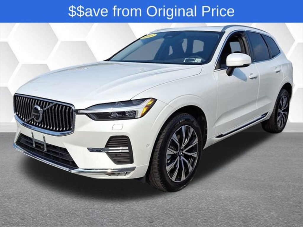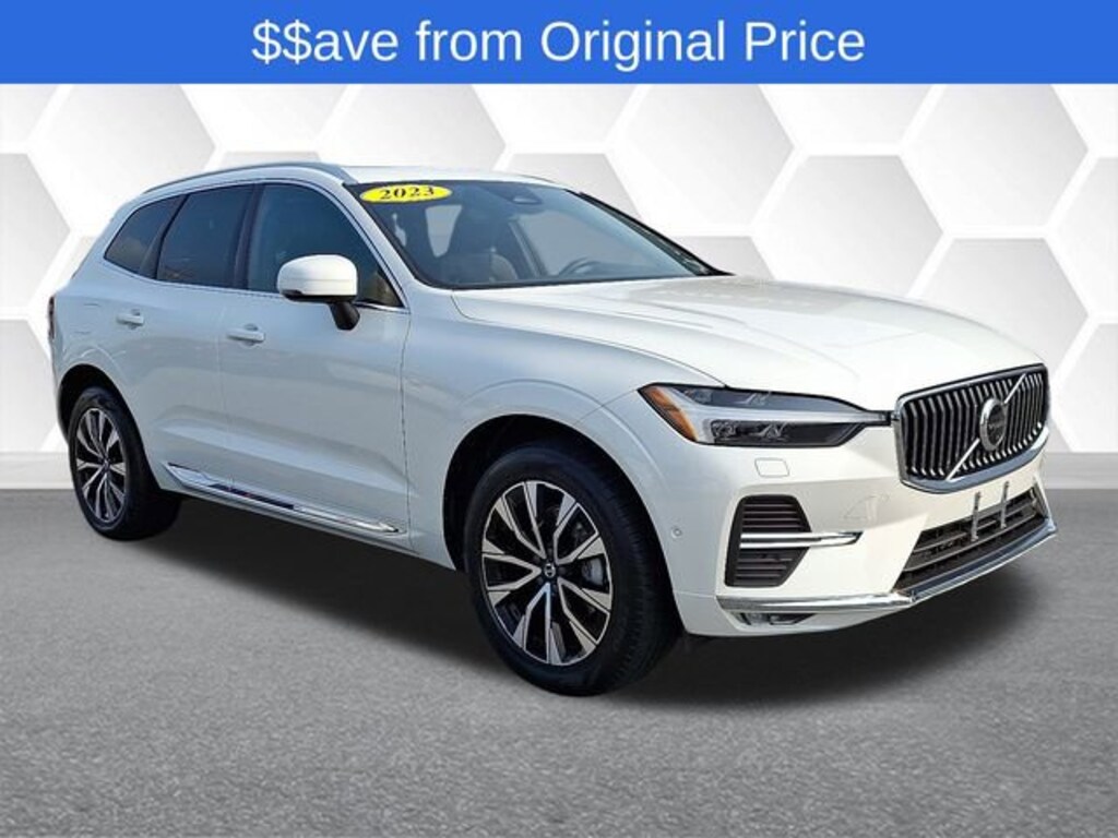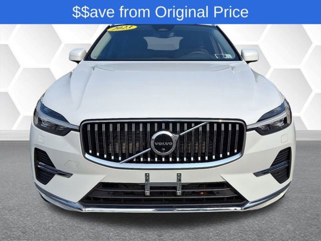 Certified. Crystal White Metallic 2023 Volvo XC60 B5 Plus Bright Theme AWD Automatic with Geartronic 2.0L I4 Turbocharged 4D Sport Utility Climate Package, Heated Rear Seats, Heated Steering Wheel, 10 Speakers, 4-Wheel Disc Brakes, ABS brakes, Air Conditioning, Alloy wheels, AM/FM radio: SiriusXM, Anti-whiplash front head restraints, Apple CarPlay, Auto High-beam Headlights, Auto-dimming door mirrors, Auto-dimming Rear-View mirror, Automatic temperature control, Brake assist, Bumpers: body-color, Delay-off headlights, Driver door bin, Driver vanity mirror, Dual front impact airbags, Dual front side impact airbags, Electronic Stability Control, Emergency communication system: Volvo Cars App w/4 Year Subscription, Exterior Parking Camera Rear, Four wheel independent suspension, Front anti-roll bar, Front Bucket Seats, Front Center Armrest, Front dual zone A/C, Front fog lights, Front reading lights, Fully automatic headlights, Garage door transmitter: HomeLink, Genuine wood console insert, Genuine wood dashboard insert, Heated door mirrors, Heated Front Bucket Seats, Heated front seats, Illuminated entry, Knee airbag, Leather Shift Knob, Leather Upholstery, Low tire pressure warning, Memory seat, Occupant sensing airbag, Outside temperature display, Overhead airbag, Panic alarm, Passenger door bin, Passenger vanity mirror, Power door mirrors, Power driver seat, Power moonroof, Power passenger seat, Power steering, Power windows, Radio data system, Radio: High Performance Audio System, Rain sensing wipers, Rear anti-roll bar, Rear fog lights, Rear reading lights, Rear seat center armrest, Rear window defroster, Rear window wiper, Remote keyless entry, Security system, Speed control, Split folding rear seat, Spoiler, Steering wheel mounted audio controls, Tachometer, Telescoping steering wheel, Tilt steering wheel, Traction control, Trip computer, Turn signal indicator mirrors, Variably intermittent wipers, Wheels: 19" 5-V Spoke Black Diamond Cut Alloy, Climate Package, Heated Rear Seats, Heated Steering Wheel.