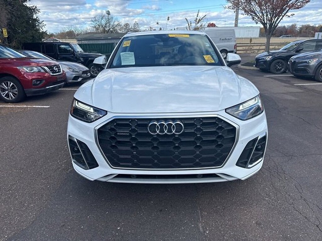 Ibis White 2022 Audi Q5 45 S line Premium quattro quattro 7-Speed Automatic S tronic 2.0L Turbocharged Black Leather, Audi Advanced Key, Auto-Dimming Power Folding Exterior Mirrors, Automatic temperature control, Convenience Package, Driver Seat Memory, Exterior Parking Camera Rear, Heated front seats, Heated Steering Wheel, Illuminated entry, Leather Seating Surfaces, Panoramic Sunroof, Power Liftgate, SiriusXM All Access Service, Wheels: 18 5-Arm-Star Design.