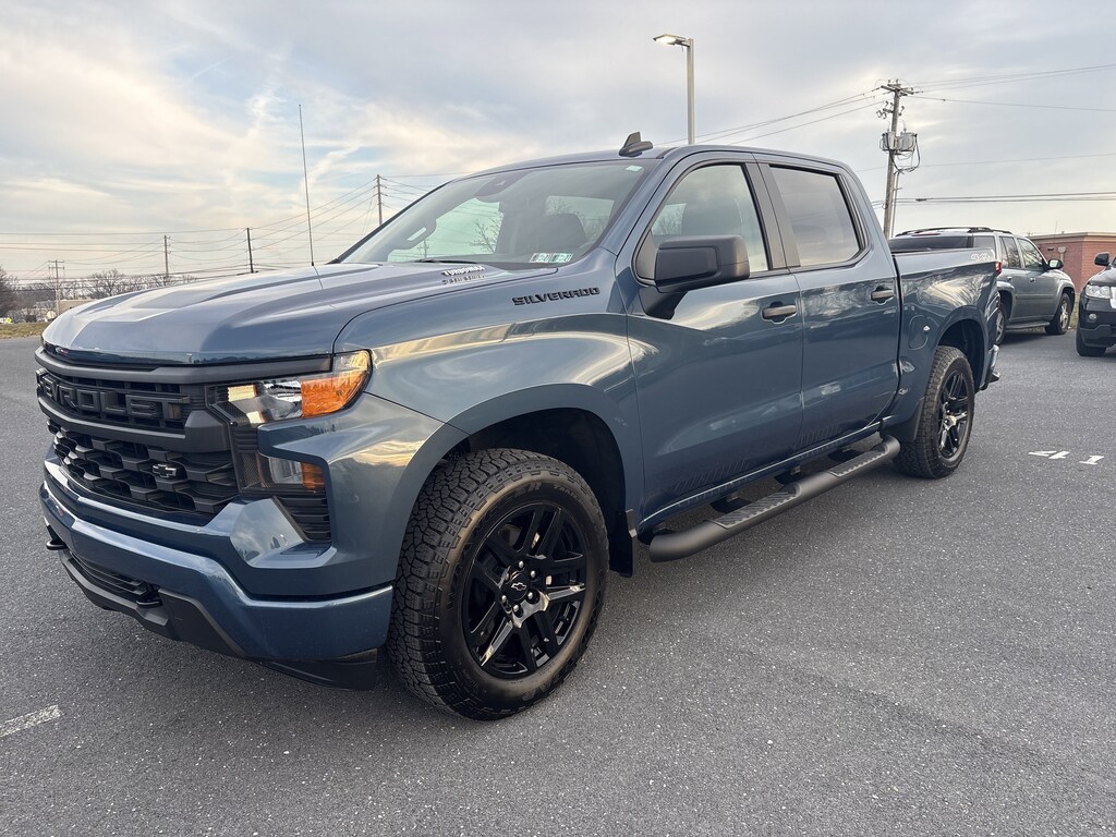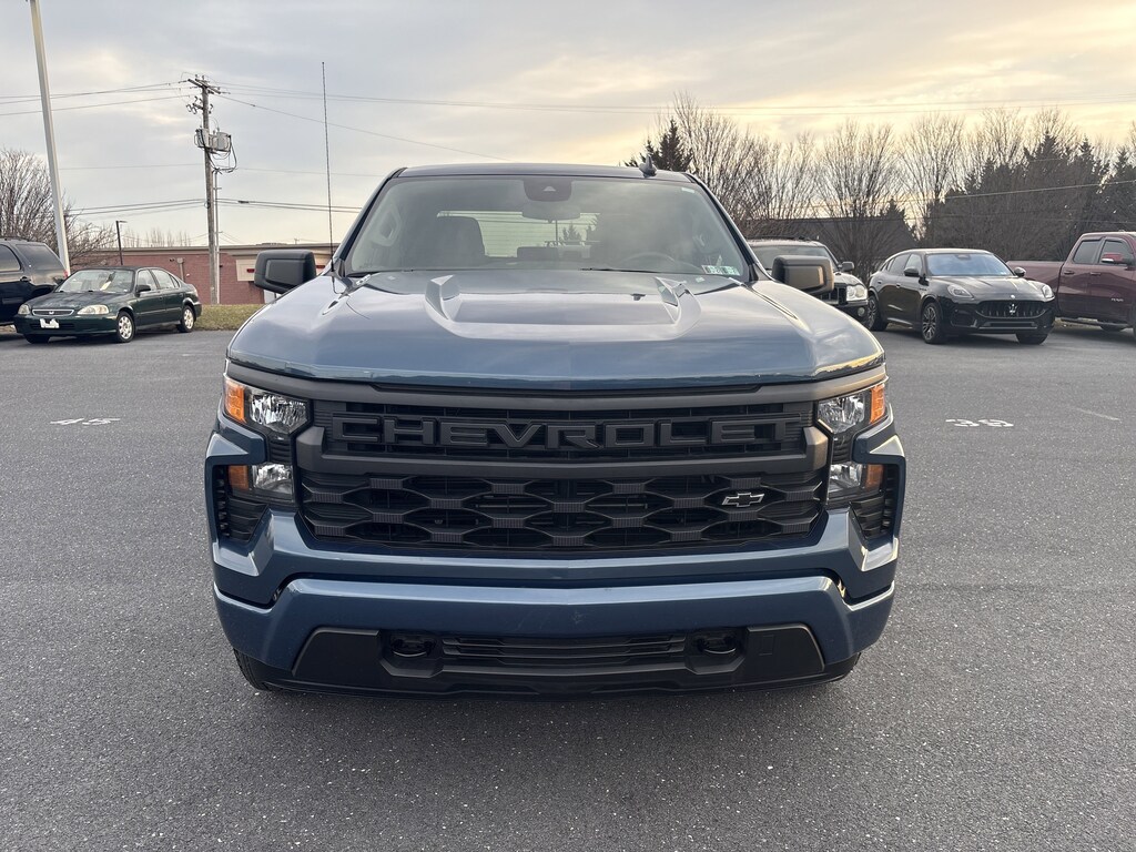 Recent Arrival! Clean CARFAX. Lakeshore Blue Metallic This Silverado 1500 Custom is nicely equipped with Custom Convenience Package (Electric Rear-Window Defogger, EZ Lift Power Lock & Release Tailgate, LED Cargo Area Lighting, Remote Vehicle Starter System, and Theft Deterrent System (Unauthorized Entry)), Custom Value Package, Dark Essentials Package (LPO) (Black Name Plates (LPO)), High Capacity Suspension Package, Preferred Equipment Group 1CX (10-Way Power Driver Seat w/Lumbar, 120-Volt Bed Mounted Power Outlet, 120-Volt Interior Power Outlet, 3.5 Monochromatic Display Driver Info Center, Bluetooth® For Phone, Chevrolet Connected Access Capable, Color-Keyed Carpeting Floor Covering, Deep-Tinted Glass, Dual Rear USB Ports (Charge Only), Electrical Steering Column Lock, Electronic Cruise Control, Front Frame-Mounted Black Recovery Hooks, Front Rubberized Vinyl Floor Mats, HD Rear Vision Camera, Manual Tilt Wheel Steering Column, OnStar & Chevrolet Connected Services Capable, Power Front Windows w/Driver Express Up/Down, Power Front Windows w/Passenger Express Down, Power Rear Windows w/Express Down, Rear 60/40 Folding Bench Seat (Folds Up), Rear Rubberized-Vinyl Floor Mats, Remote Keyless Entry, SiriusXM Radio, Standard Tailgate, and Wi-Fi Hot Spot Capable), Trailering Package (Hitch Guidance), TurboMax Blackout Package (4 Black Round Assist Steps (LPO) and Wheels: 20 x 9 High Gloss Black Painted Alum), 8-Speed Automatic, 4WD, Black Cloth, 3.42 Rear Axle Ratio, 4-Wheel Disc Brakes, 40/20/40 Front Split-Bench Seat, 6 Speakers, 6-Speaker Audio System, ABS brakes, Air Conditioning, Alloy wheels, AM/FM radio: SiriusXM, Auto High-beam Headlights, Automatic Emergency Braking, Black Tailgate CHEVROLET Lettering (LPO), Brake assist, Bumpers: body-color, Cloth Seat Trim, Compass, Delay-off headlights, Driver door bin, Driver vanity mirror, Dual front impact airbags, Dual front side impact airbags, Electronic Stability Control, Following Distance Indicator, Forward Collision Alert, Front anti-roll bar, Front Black Bowtie Emblem (LPO), Front Center Armrest w/Storage, Front Pedestrian Braking, Front reading lights, Front wheel independent suspension, Fully automatic headlights, Heated door mirrors, Illuminated entry, Integrated Trailer Brake Controller, IntelliBeam Automatic High Beam On/Off, Lane Keep Assist w/Lane Departure Warning, Low tire pressure warning, Occupant sensing airbag, Outside temperature display, Overhead airbag, Overhead console, Panic alarm, Passenger door bin, Passenger vanity mirror, Power door mirrors, Power driver seat, Power steering, Power windows, Premium audio system: Chevrolet Infotainment 3, Radio data system, Radio: Chevrolet Infotainment 3 System, Rear reading lights, Rear step bumper, Rear window defroster, Remote keyless entry, Security system, Single Outlet Exhaust, Speed control, Speed-sensing steering, Split folding rear seat, Tachometer, Tilt steering wheel, Traction control, Trip computer, Variably intermittent wipers, Voltmeter, and Wheels: 20 x 9 Bright Silver Painted Aluminum. 8-Speed Automatic, 4WD, Black Cloth.