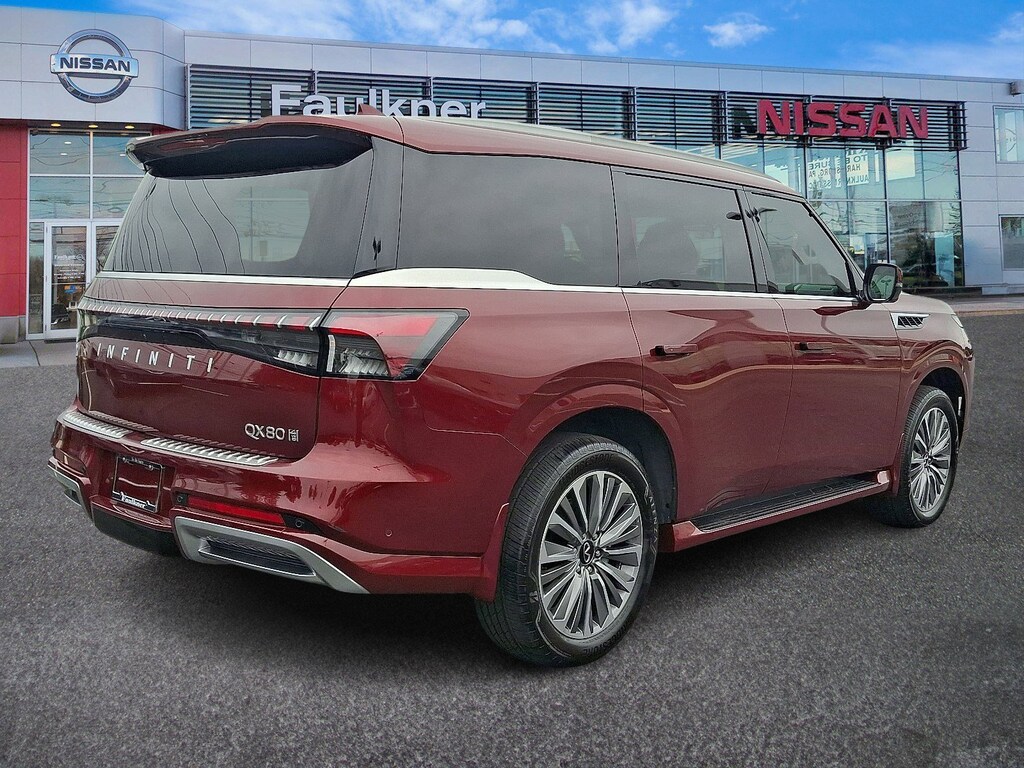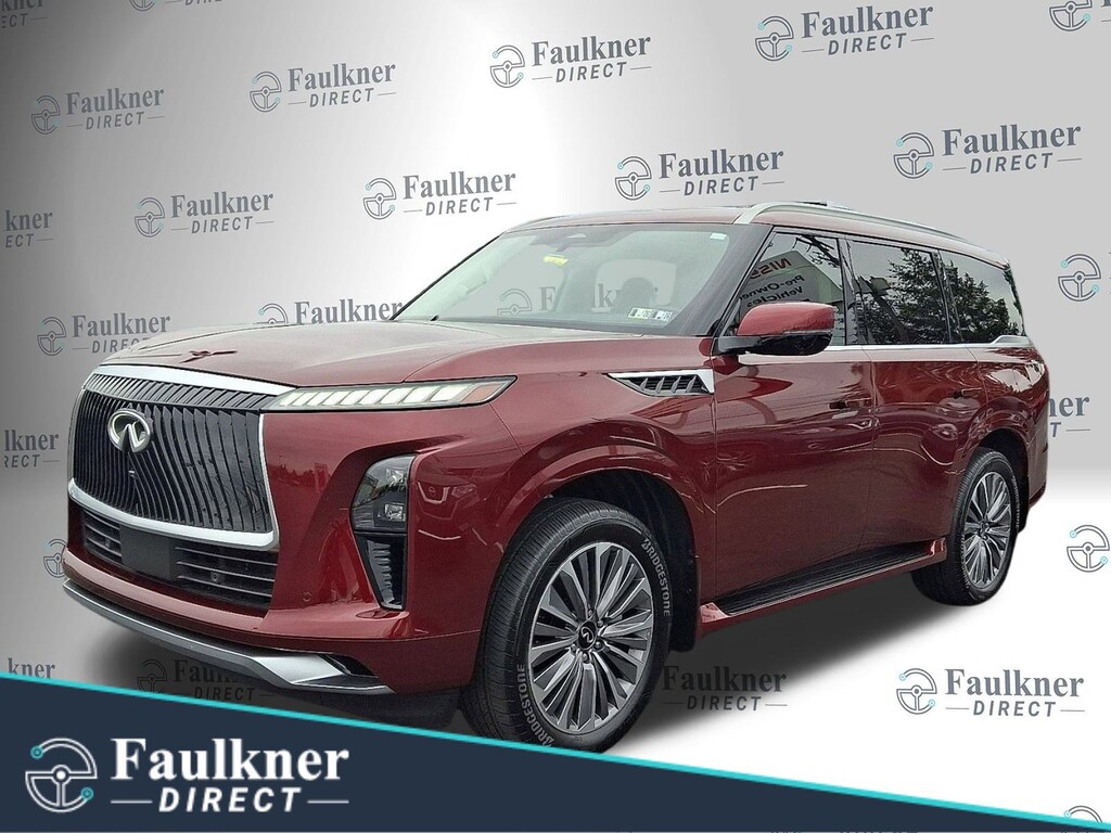 2025 INFINITI QX80 SENSORY CERTIFIED 7YR/100K WARRANTY Coulis Red *Schedule a test Drive at your home or office*, *Non-Smoker*, 3rd row seats: bench, Apple CarPlay/Android Auto, Cargo Blocks, Climate Controlled Front Bucket Seats w/Massage, Console Net, Emergency communication system: INFINITI InTouch, Exterior Package, Heads-Up Display, Heated front seats, Heated rear seats, INFINITI Radiant Silver Cargo Scuff Plates, Knee airbag, Matte Chrome Rear Bumper Protector, Memory seat, Navigation system: Google Built-in, Panoramic Illuminated Headliner, Power Liftgate, Power moonroof, Premium Cargo Package, ProPILOT Assist 2.1 (SENSORY Grade), Radio: Klipsch Reference Premiere Audio System, Reclining 3rd row seat, Reversible Cargo Mat, Silver Cross Bars, Silver Interior Lighting Package, Smart Luggage Shelf, Soft Sided Cooler, Steering wheel mounted audio controls, Traction control, Wheels: 22 x 8 Cast Aluminum Alloy, 4-Wheel Disc Brakes, ABS brakes, Adaptive suspension, Air Conditioning, Alloy wheels, AM/FM radio: SiriusXM with 360L, Anti-whiplash front head restraints, Audio memory, Auto High-beam Headlights, Auto tilt-away steering wheel, Auto-dimming door mirrors, Auto-dimming Rear-View mirror, Auto-leveling suspension, Automatic temperature control, Brake assist, Bumpers: body-color, Center Front Spoiler, Compass, Delay-off headlights, Driver door bin, Driver vanity mirror, Dual front impact airbags, Dual front side impact airbags, Electronic Stability Control, Four wheel independent suspension, Front anti-roll bar, Front Bucket Seats, Front Center Armrest, Front dual zone A/C, Front reading lights, Fully automatic headlights, Garage door transmitter: myQ Connected Garage, Genuine wood dashboard insert, Genuine wood door panel insert, Heated door mirrors, Heated steering wheel, HVAC memory, Illuminated entry, Leather steering wheel, Literature Kit, Low tire pressure warning, Occupant sensing airbag, Outside temperature display, Overhead airbag, Overhead console, Panic alarm, Passenger door bin, Passenger vanity mirror, Power door mirrors, Power driver seat, Power passenger seat, Power steering, Power windows, Premium Paint, Radio data system, Rain sensing wipers, Rear air conditioning, Rear anti-roll bar, Rear reading lights, Rear seat center armrest, Rear window defroster, Rear window wiper, Remote keyless entry, Security system, Semi-Aniline Premium Leather Seating Surfaces, Speed control, Speed-sensing steering, Splash Guards, Split folding rear seat, Spoiler, Steering wheel memory, Tachometer, Telescoping steering wheel, Tilt steering wheel, Trip computer, Turn signal indicator mirrors, Umbrella Holder, Variably intermittent wipers, Ventilated front seats, Ventilated rear seats, 3rd row seats: bench, Apple CarPlay/Android Auto, Cargo Blocks, Climate Controlled Front Bucket Seats w/Massage, Console Net, Emergency communication system: INFINITI InTouch, Exterior Package, Heads-Up Display, Heated front seats, Heated rear seats, INFINITI Radiant Silver Cargo Scuff Plates, Knee airbag, Matte Chrome Rear Bumper Protector, Memory seat, Navigation system: Google Built-in, Panoramic Illuminated Headliner, Power Liftgate, Power moonroof, Premium Cargo Package, ProPILOT Assist 2.1 (SENSORY Grade), Radio: Klipsch Reference Premiere Audio System, Reclining 3rd row seat, Reversible Cargo Mat, Silver Cross Bars, Silver Interior Lighting Package, Smart Luggage Shelf, Soft Sided Cooler, Steering wheel mounted audio controls, Traction control, Wheels: 22 x 8 Cast Aluminum Alloy.
