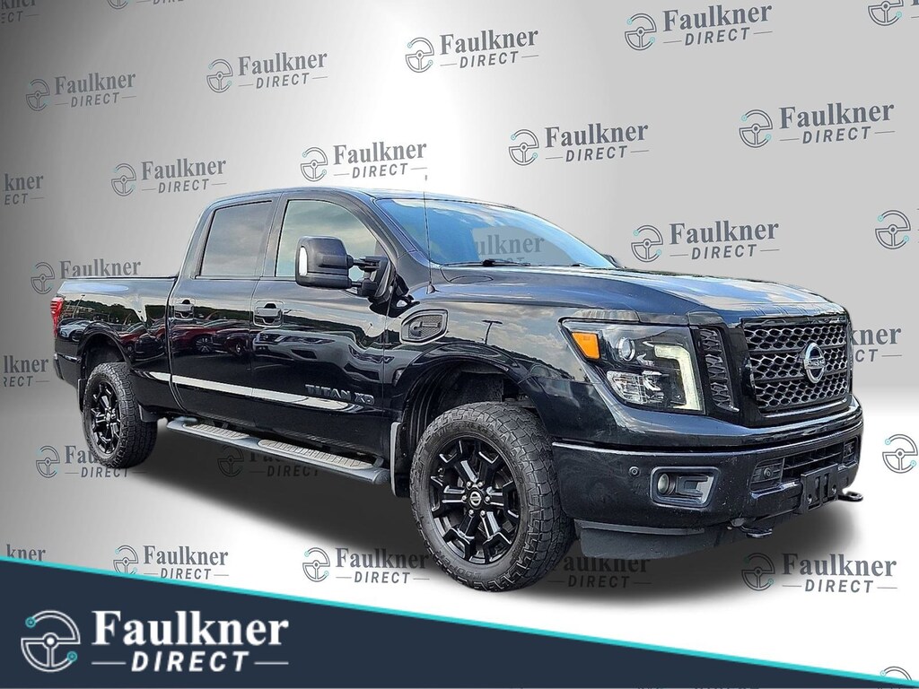Magnetic Black 2018 Nissan Titan XD SV 4WD 6-Speed Automatic 5.0L V8 Auto Dual Zone HVAC, Auto On/Off Headlights, Auto-Dimming Rear-View Mirror, Black Exterior Badging, Black Mirrors & Door Handles, Black Step Rails, Blind Spot Warning w/Rear Cross Traffic Alert, Body Color Front & Rear Bumpers, Body Color Front Grille w/Dark Insert, Charcoal Interior Trim, Chrome Interior Door Locks, Convex Spotter Mirror, Dark Headlamps, Fog Lamps w/Black Fog Lamp Finishers, Front & Rear Parking Sensors, Heated Front Captain's Seats w/Center Console, Intelligent Key System, Leather Wrapped Steering Wheel, Midnight Edition, Painted Rear Bumper, Power Slide Rear Window w/Defogger, Radio: Nissan Navigation System w/Voice Guidance, Rain Sensing Wipers, Rear HVAC Vents, Siri Eyes Free, Step Rails, SV Convenience Package, Universal Garage Door Opener, Wheels: 20 x 7.5 Black Painted, Wheels: 20 x 7.5 Painted Alloy.