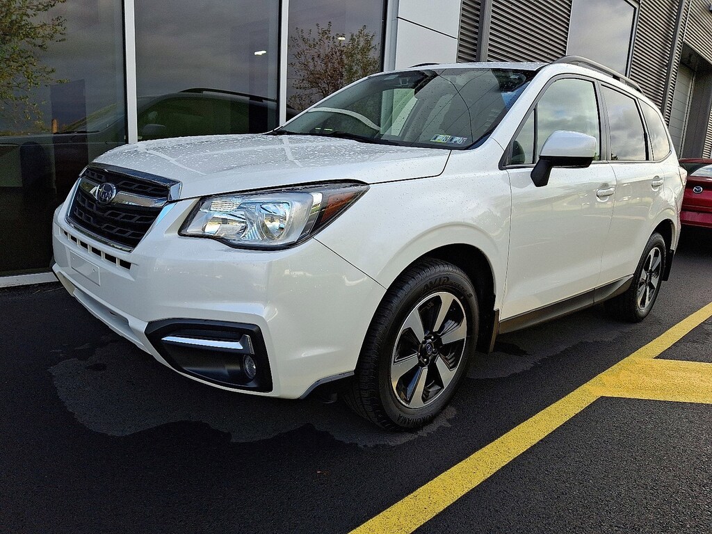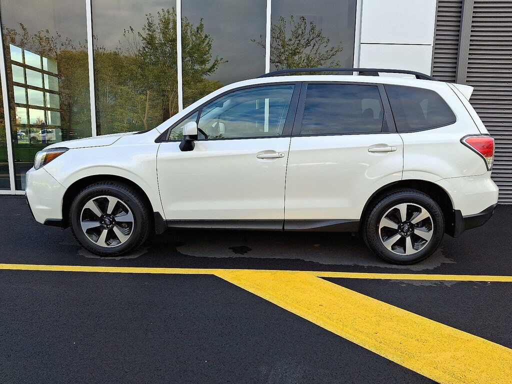 Clean CARFAX. CARFAX One-Owner. Crystal White Pearl 2018 Subaru Forester 2.5i Premium AWD Lineartronic CVT 2.5L 4-Cylinder DOHC 16V VVT All-Weather Pkg & EyeSight & Blind Spot Detection, Blind Spot Detection w/Rear Cross Traffic Alert, EyeSight System, Heated Exterior Mirrors, Heated Front Seats, High Grade Instrument Cluster w/Color LCD Display, Steering Responsive Fog Lights (SRF), Windshield Wiper De-Icer.