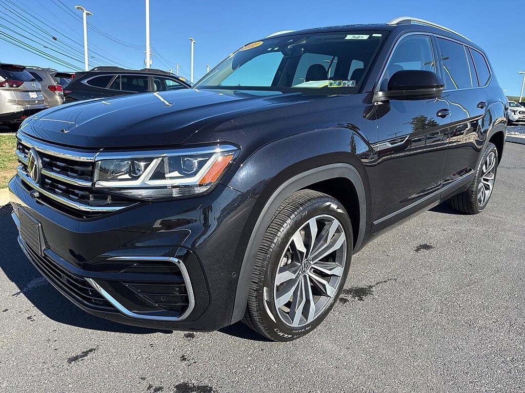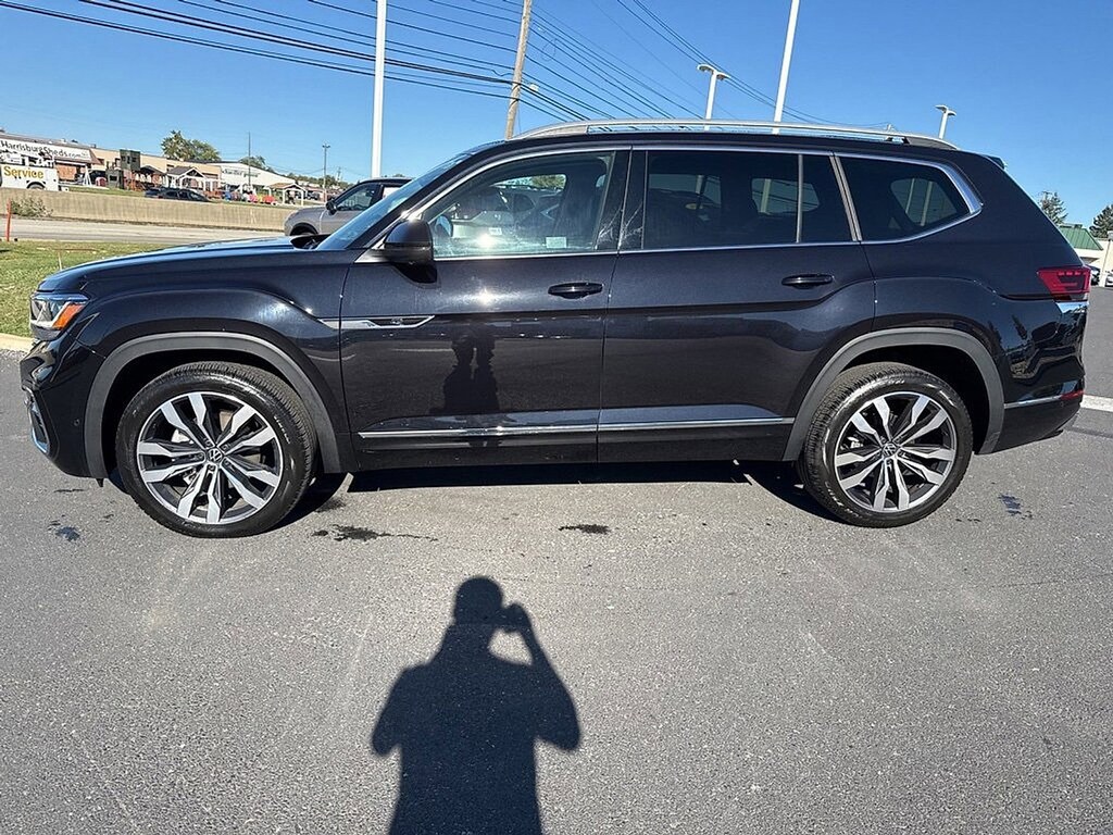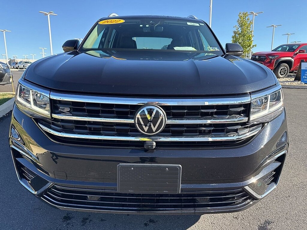 CARFAX One-Owner, Local Trade, Non-Smoker, 12 Speakers, 4-Wheel Disc Brakes, ABS brakes, Active Cruise Control, Auto High-beam Headlights, Auto-dimming Rear-View mirror, Automatic temperature control, Dual front impact airbags, Dual front side impact airbags, Emergency communication system, Front dual zone A/C, Fully automatic headlights, Heated front seats, Heated rear seats, Heated steering wheel, Htd/Actively Ventilated Comfort Front Sport Seats, Illuminated entry, Low tire pressure warning, Navigation System, Occupant sensing airbag, Outside temperature display, Overhead airbag, Perforated Vienna Leather Seating Surfaces, Power Liftgate, Power moonroof: Panoramic, Power passenger seat, Radio: MIB3 Discover Media w/8 Touchscreen Nav, Rain sensing wipers, Remote keyless entry, Split folding rear seat, Steering wheel mounted audio controls, Telescoping steering wheel, Tilt steering wheel, Turn signal indicator mirrors, Variably intermittent wipers, Ventilated front seats, Wheels: 21 2-Tone Machined Alloy. CARFAX One-Owner. Deep Black Pearl 2022 Volkswagen Atlas 3.6L V6 SEL Premium R-Line AWD 8-Speed Automatic with Tiptronic 3.6L VR6